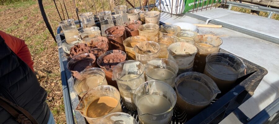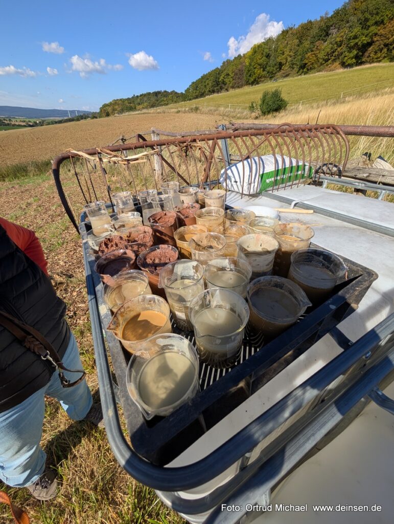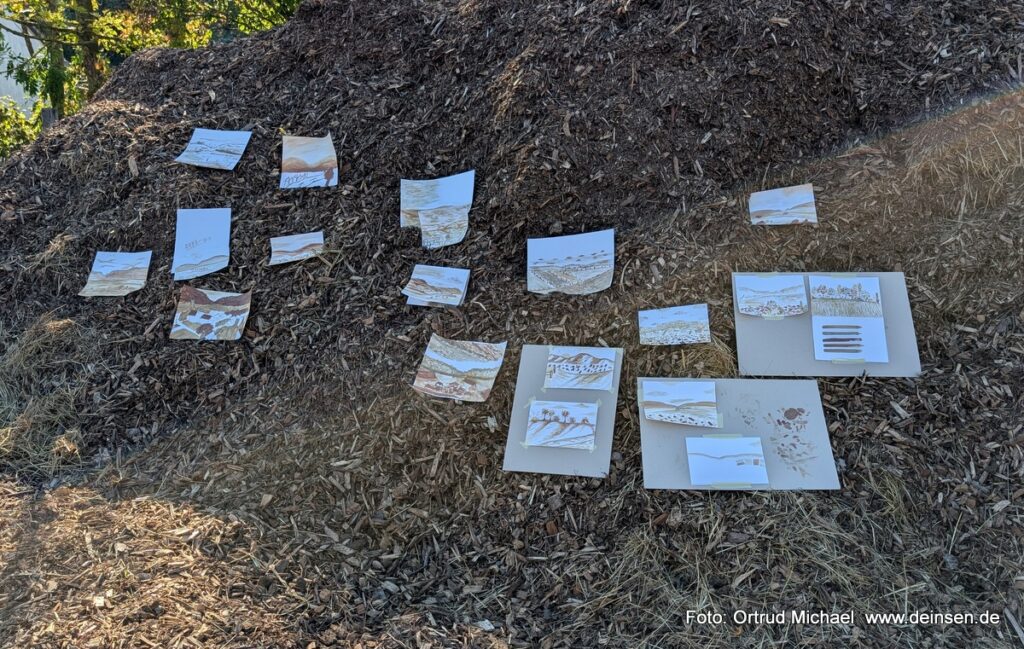 Das Seminarfach Kunst beschäftigte sich direkt vor Ort mit der Installation – und nutzte eine Technik, die wie das Werk selbst eng mit dem Thema Boden verbunden ist: das Zeichnen mit Erdfarben. Aus den mineralischen Pigmenten entstanden Arbeiten, die die Transparenz und Fragilität der Heuhaufenformen auf individuelle Weise auf Papier übertrugen.